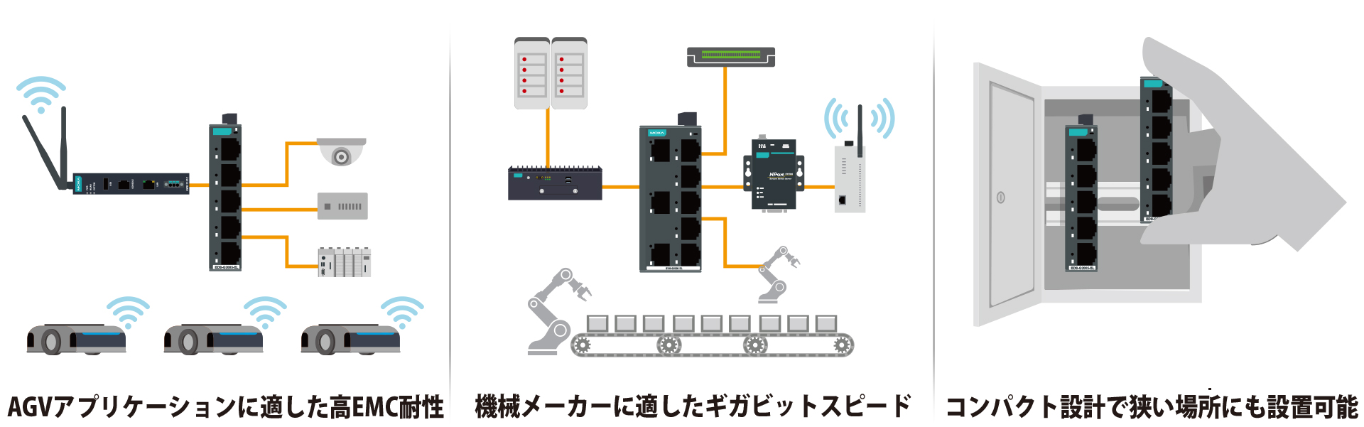 Moxaのアンマネージドスイッチポートフォリオは、冷凍食品工場のような過酷な環境や移動するAGV、高速性と効率性が求められる生産設備やマシン制御キャビネットなど、あらゆる産業用アプリケーションにおいて堅牢で信頼性の高いネットワーク接続をコスト効率よく実現します。
