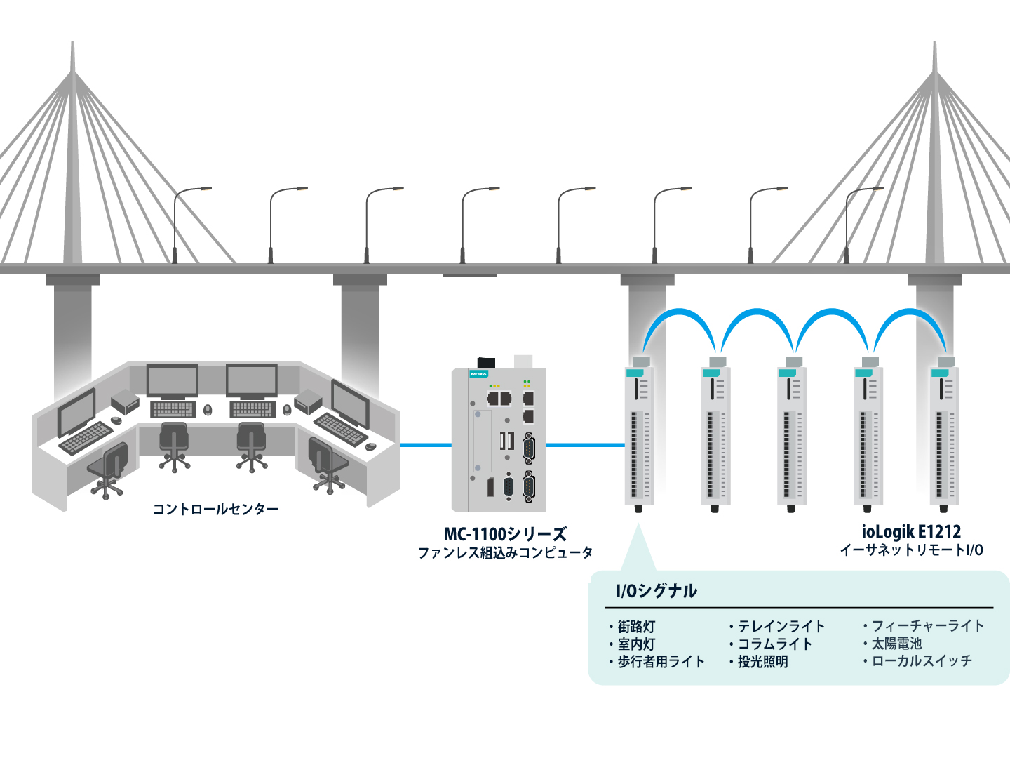 長距離の橋梁照明システムには、エネルギー効率や費用対効果、拡張性に優れた制御メカニズムが必要です。従来のスター型ネットワークでは大規模なインフラには不十分であり、長距離接続用の堅牢なイーサネットI/Oソリューションが必要です。