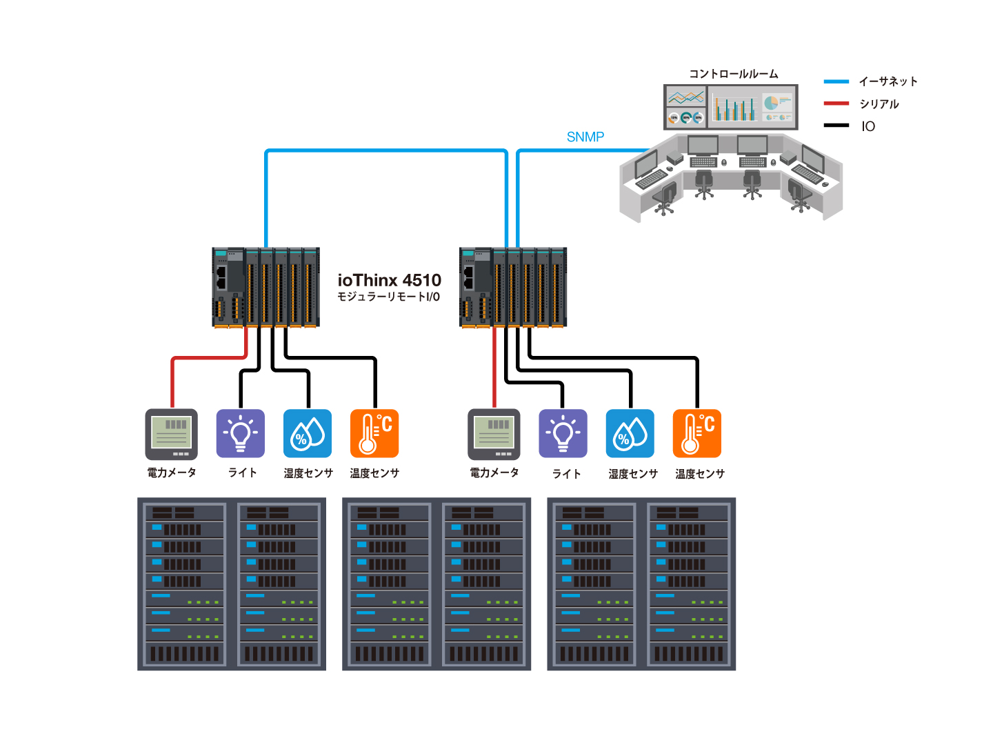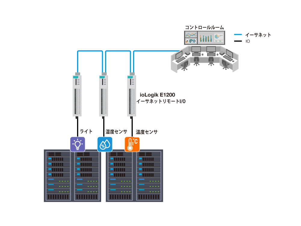 高密度環境モニタリング 大規模データセンターでは、運用の安定性を維持するために、拡張性の高いモニタリングシステムが求められます。イーサネットデイジーチェーン経由で分散I/Oを展開することで、複雑な再配線やインフラストラクチャのアップグレードを回避し、高密度のインストールが可能になります。 システム要件 ・データセンター環境を監視するITベースの管理システム ・分散設置スペース向けデイジーチェーンネットワークをサポート