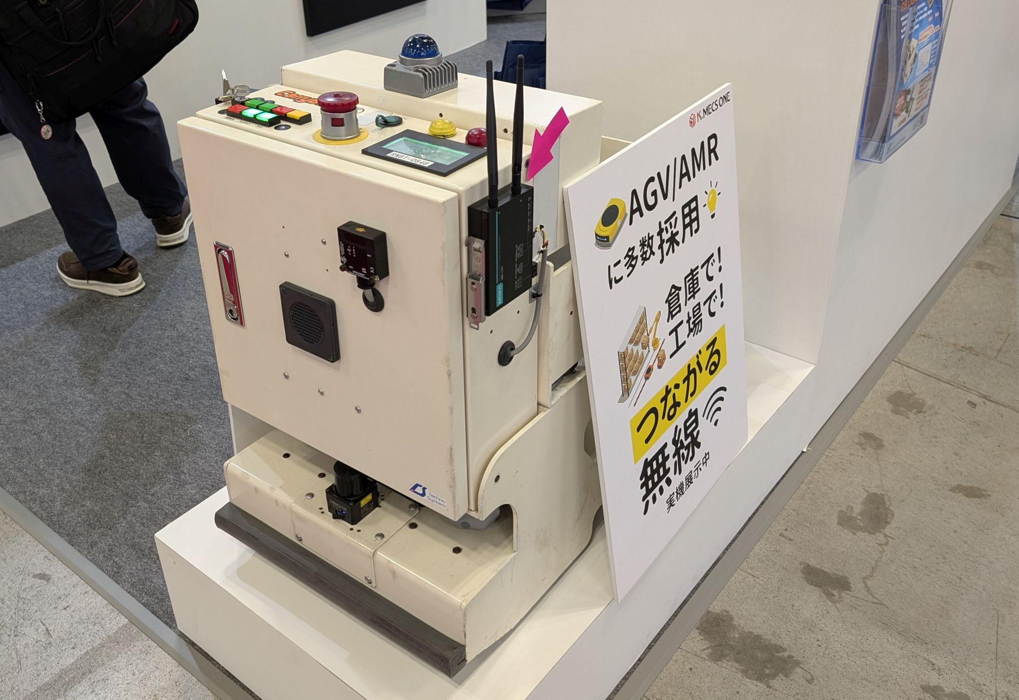 【★写真4】工場などで部品用の金属棚を搬送する自立走行ロボットで、そのヘッド車両部分にAWK-1137Cが取り付けられている。