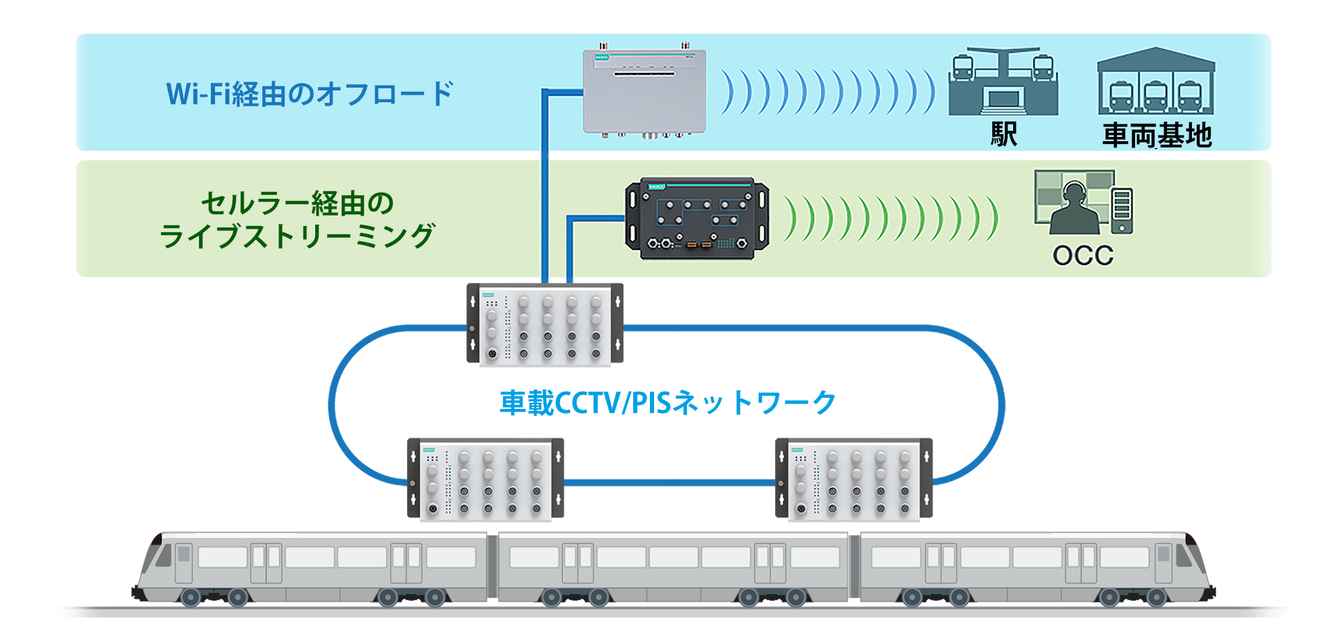 各車載サブシステムは、それぞれ独自のタスクを実行する一方、バックボーンネットワークを介して他のシステムと相互接続する必要があります。イーサネットコンシストネットワーク (ECN)を接続する信頼性の高いイーサネット列車バックボーン (ETB)ネットワークは、車載システムの統合に不可欠です。通常、車載CCTVシステムはECN上に構築され、ライブ映像を運転室へストリーミングし、IPネットワーク経由で録画します。このデータは、Wi-Fiまたはセルラー接続を介して遠隔地のOCCに転送されます。Moxaは、信頼性が高いインテリジェントなイーサネット列車ネットワークの構築に最適な、包括的な車載スイッチラインナップを提供しています。