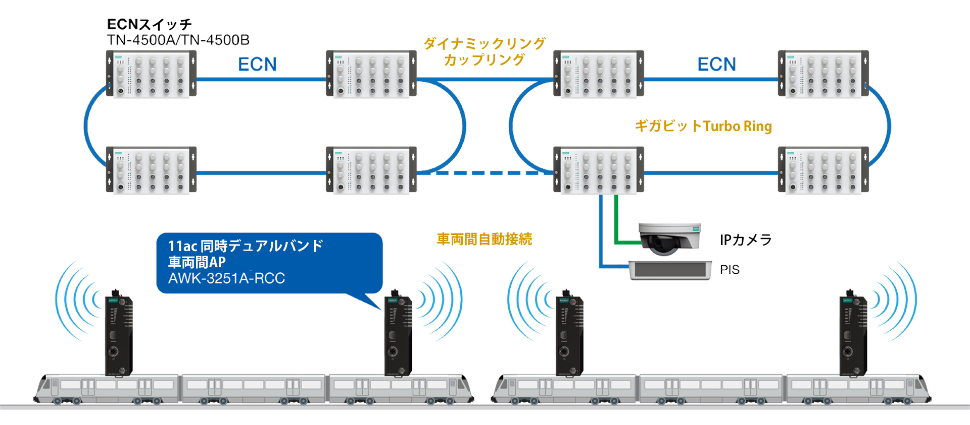 Moxaの車載スイッチソリューションは、ネットワーク設計、設置、メンテナンスを簡素化します。運行中、車両の編成は頻繁に再構成されます。標準的な冗長設計では、新しい車両編成が変わるたびにリングカップリングを再構成する必要があります。MoxaのDynamic Ring Coupling™ (DRC)技術は、編成変更時に編成内ネットワークを中断することなく、コンシスト間イーサネット冗長を実現します。その結果、CCTV、Wi-Fiアクセス、PISなどのイーサネットベースのサービスはすべて、走行中にカップリングスイッチが再配置されてもシームレスに運用を継続することができます。改造車両では、MoxaのAuto Carriage Connection (ACC)技術が車両間の無線接続を実現し、車両内の配線を削減します。さらに、Moxaのスイッチは自動設定機能をサポートしており、すべてのネットワークデバイスのIP設定を自動的に構成します。これにより、特に大量のデバイスを導入する際に労力を大幅に削減することができます。