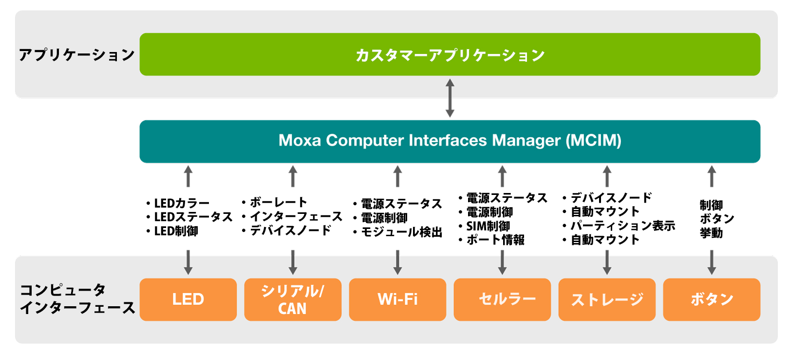 MCIMは、さまざまなI/Oハードウェアや非標準コンポーネント (DI/DO、ボタン、ディスク、ブザー、RS-232/422/485モード切り替えなど) を管理する統一インターフェースを提供することで、システム統合を効率化します。また、CLIに対応しており、さまざまなSoCプラットフォームに合わせて制御ロジックを調整する必要がないため、アプリケーション開発の手間が軽減されます。