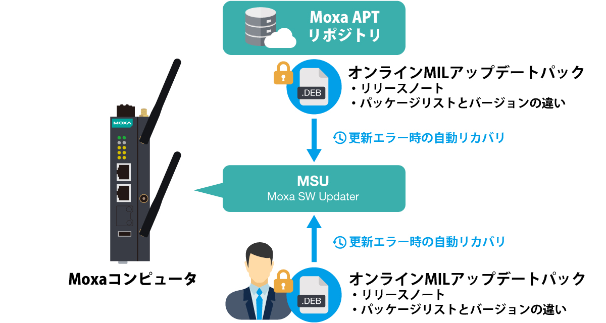 MSUを使用すると、一般的な脆弱性や脅威 (CVE) の修正を含む最新のセキュリティパッチでMoxa Industrial Linuxを最新の状態に保つことができます。MSUは、オンラインとオフラインの両方のアップデートに対応しており、アップデートがエラーとなった場合でも安全な更新処理を保証する自動リカバリメカニズムを備えています。