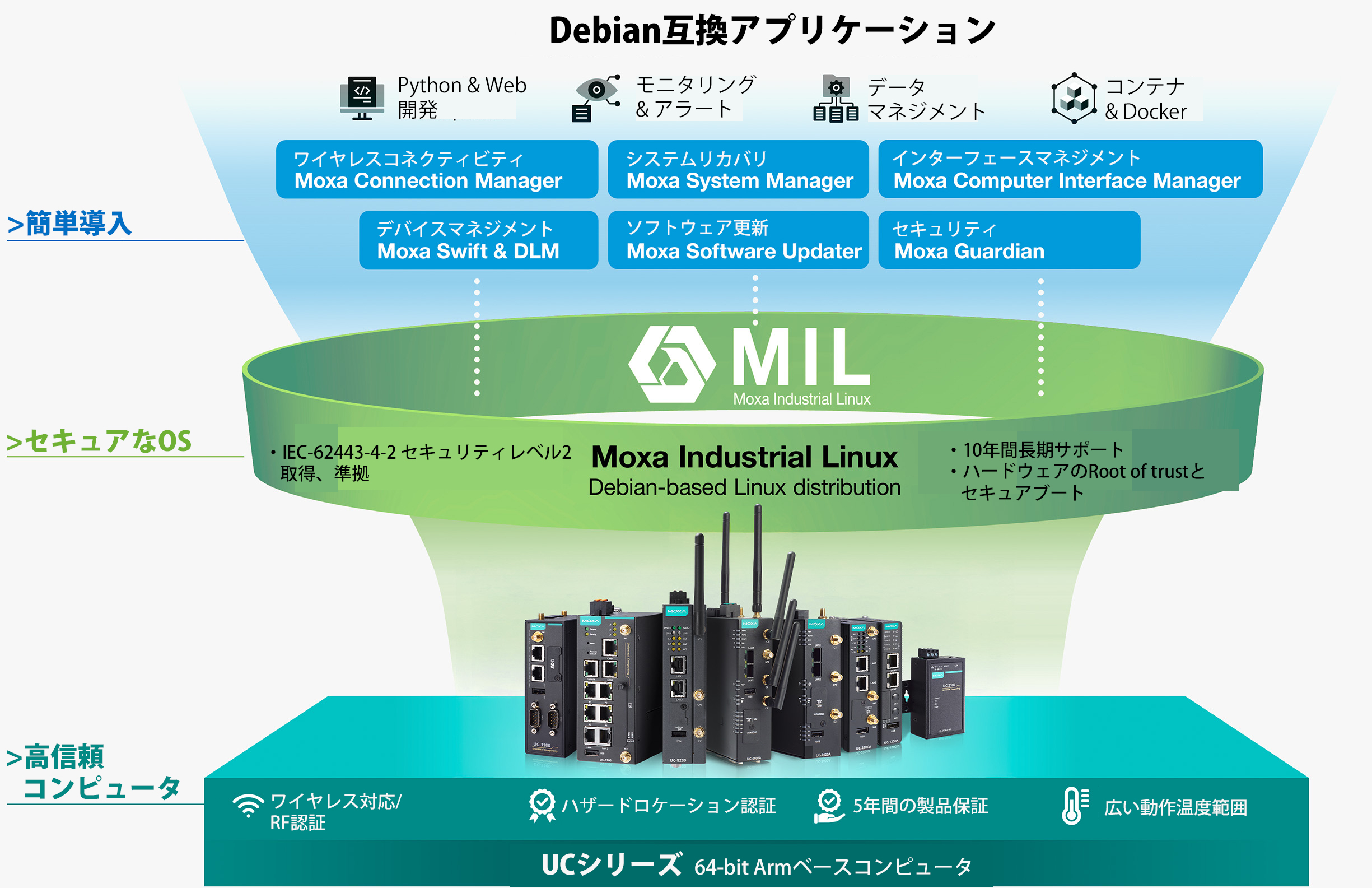 産業用通信およびネットワーク製品をリードするMoxaのArmコンピュータUC-8200シリーズは、Moxa Industrial Linux 3 (MIL3)を搭載し、IEC 62443-4-2セキュリティレベル2認証を始めて取得したコンピュータです。10年間の優れたライフサイクルサポートを備えた安全で信頼性の高いオープンプラットフォームを提供します。