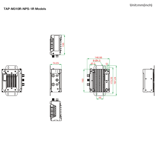 寸法 TAP-M310R-NPS-1Rモデル: 74.25 x 150 x 130 mm