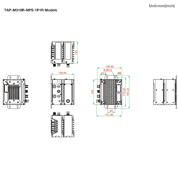 TAP-M310R-NPS-1P1Rモデル: 136.65 x 150 x 130 mm
