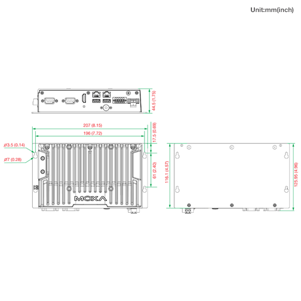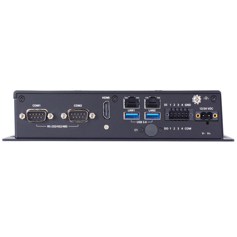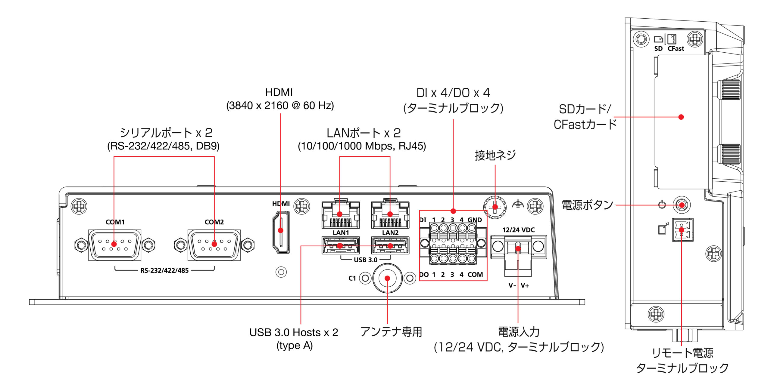 ボックスタイプコンピュータ, DINレールマウント, Intel Atom® x6425E, メモリ 8 GB, CFast x 1, SD x 1, M.2 x 1, LAN x 2, シリアル x 2, USB 3.0 x 2, DI x 4, DO x 4, HDMI x 1, 電源入力 12/24 VDC |