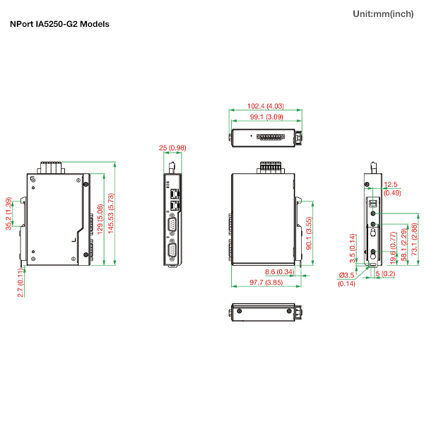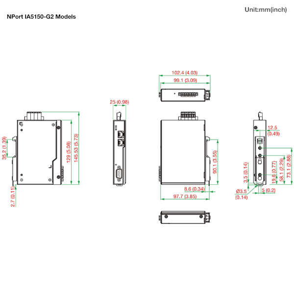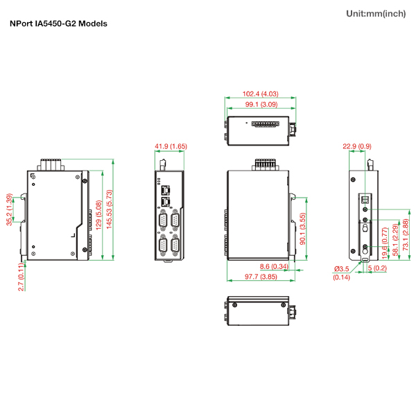 | 寸法 | NPort IA5150-G2/IA5250-G2モデル: 25 x 89 x 129 mm NPort IA5450-G2モデル: 42 x 89 x 129 mm |