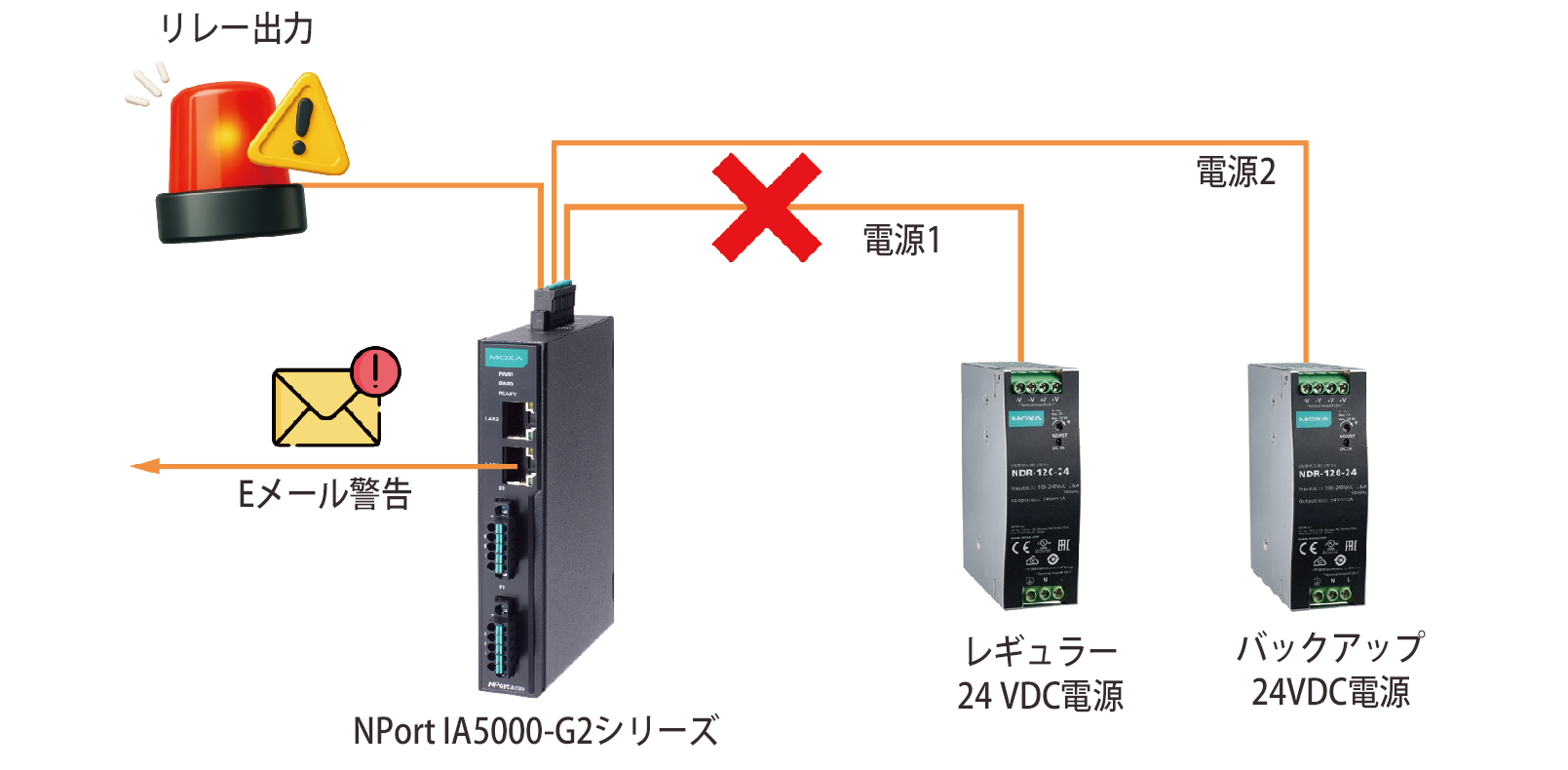 内蔵されているリレー出力は、ネットワークがダウンしたとき、停電が発生したとき、またはDCDまたはDSRのシリアル信号に変化があったときに管理者に警告するために使用することができます。異常が検出されたときに電子メール警告を発行することもできます。これらの機能は、メンテナンスエンジニアが緊急事態に迅速に対応できる重要なツールです。