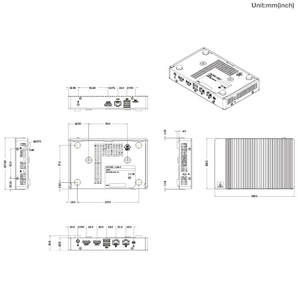 | フロントI/O | 2 x USB 3.2 Gen 1 1 x COMポート (RS-232) (RJ45タイプ) 1 x Micro SDカードスロット (USB 2.0) 1 x 電源ボタン 1 x HDMI |
